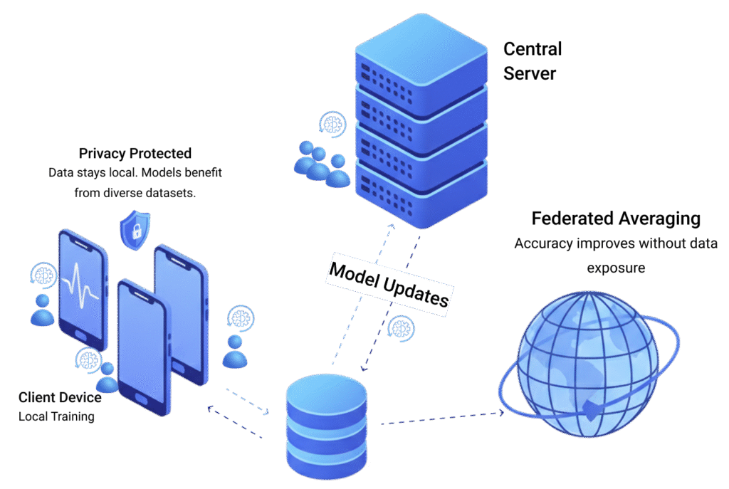 Data remains on individual devices, ensuring privacy, security, and confidentiality.