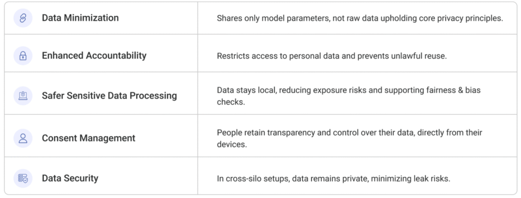 - Shares only model updates, not raw user data, metadata, or logs, reducing the chances of regulatory violations.