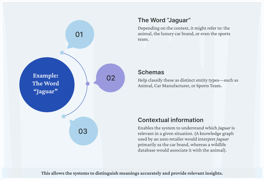 - Disambiguation to resolve semantic issues and help distinguish entities contextually, like Orange the fruit and Orange the color.