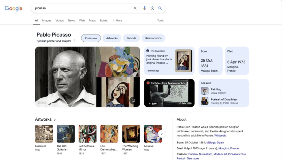 Let’s say, you search for “Pablo Picasso” – It doesn’t just show web links; it displays a summary with key facts, images, and related topics to give you a clearer, more helpful answer. This knowledge graph helps Google understand the relationships between different entities to provide more precise search results.
