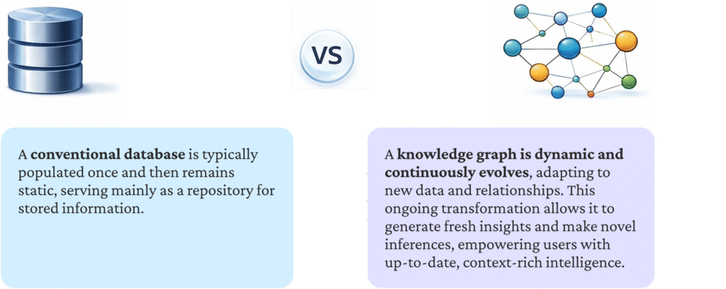 Knowledge Graphs create a dynamic semantic network by linking every data element—whether people, processes, applications, or assets—allowing AI and humans alike to explore how and why these elements are connected, delivering insights almost instantly.