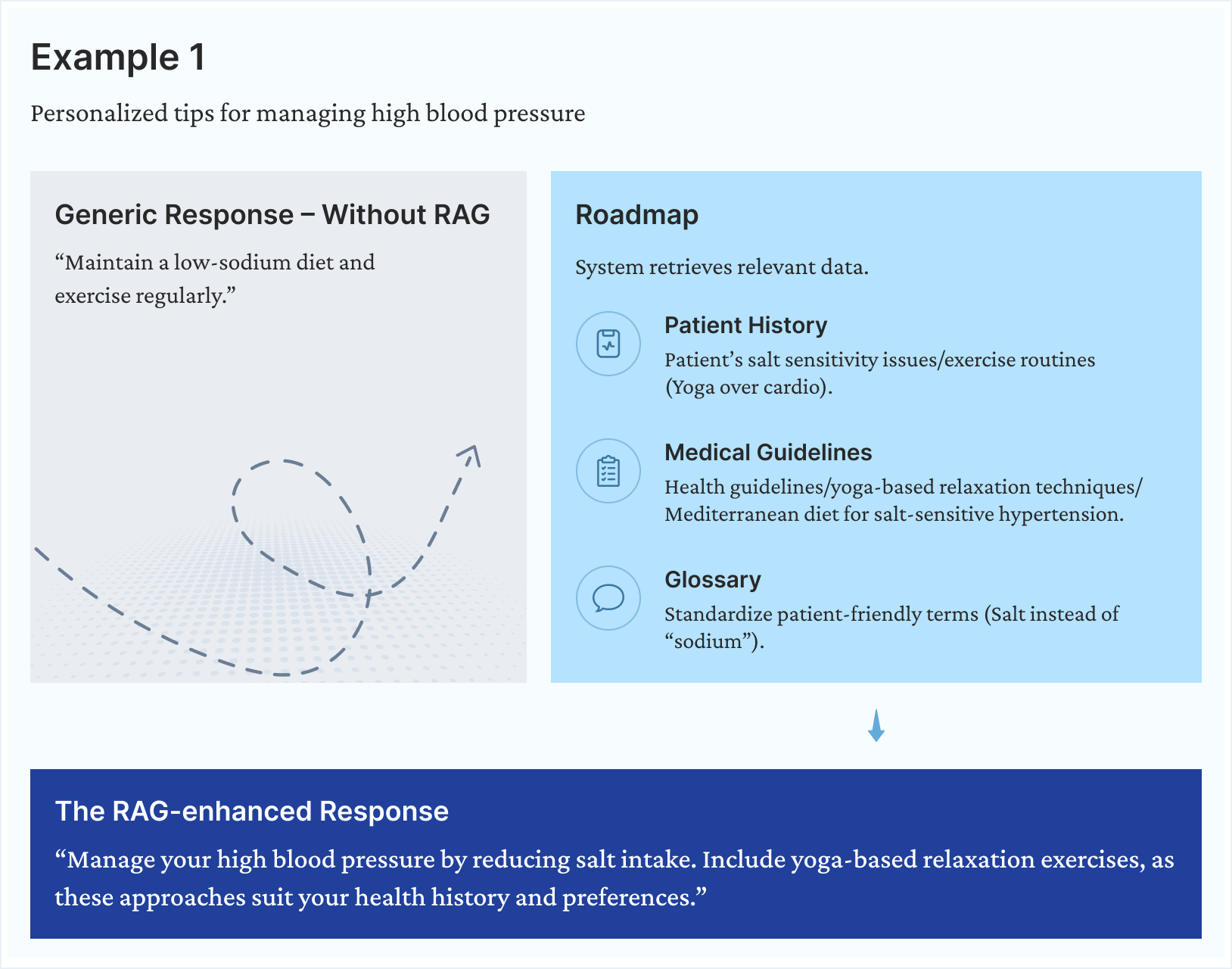 RAG can create tailored treatment plans, wellness recommendations, and educational materials based on individual patient needs, preferences, and health updates.